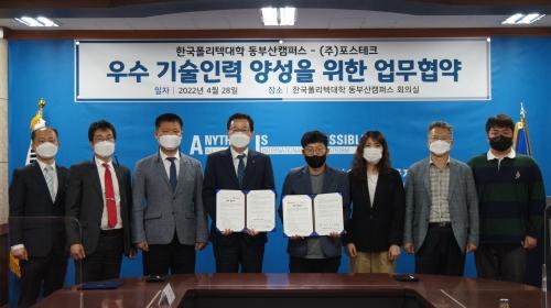 한국폴리텍대학 동부산캠퍼스(학장 황선구)는 지난달 28일 (주)포스테크(대표이사 고종철)와 업무협약을 체결했다. 동부산캠퍼스는 이번 업무협약을 통해 (주)포스테크로부터 교육훈련 장비와 시설 기증 등 다양한 지원을 받게 됐다. 특히 용접분야 전문가인 고종철 대표를 동부산캠퍼스 학과 개편 자문위원으로 위촉해 부울경지역 최대 규모 용접실습장을 자랑하는 그린에너지설비과의 개편에 도움을 줄 예정이다. 김상훈 기자