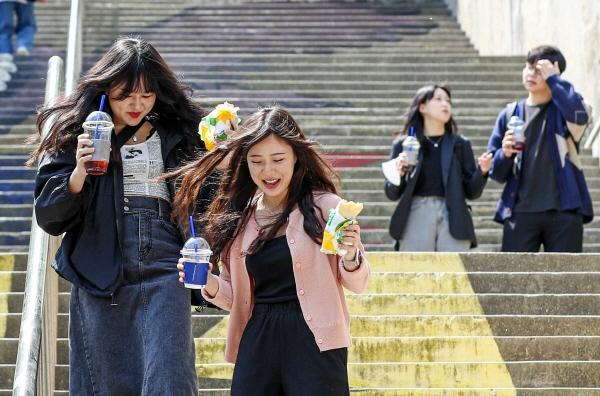 566일 만에 실외 마스크 착용 의무가 해제된 2일 오후 부산 경성대학교에서 학생들이 마스크를 벗은 채 밝은 표정으로 캠퍼스를 걷고 있다. 김종진 기자 kjj1761@부산의 코로나19 하루 확진자가 3개월 만에 1000명 아래로 떨어졌다. 세 자릿수 확진자는 야외 마스크 착용 의무 해제와 맞물려 본격적인 일상회복에 대한 기대감을 키웠다.