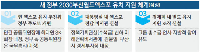“우리나라 5~10대 대기업들이 가진 글로벌 통상 네트워크가 굉장히 강한데, 지금까지 (재계에서)엑스포 유치에 역할을 잘 못해왔다. 그래서 윤 당선인이 직접 경제계를 대표하는 최태원 대한상의 회장과 소통해 공동 유치위원장 수락을 받았다. 또 경제계에서 부산월드엑스포 유치지원조직을 별도로 만들 예정이다. 여기에서도 최 회장이 역할을 맡고, 국내 5~10대 기업 총수들도 힘을 모아 부산월드엑스포 유치에 힘을 쏟는 걸로 가닥을 잡고 있다.”