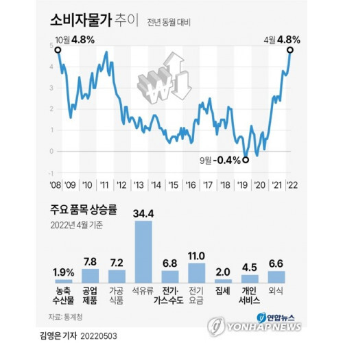 통계청에 따르면 4월 소비자물가지수는 국제 에너지 가격 급등, 공급망 차질 등의 영향으로 작년 같은 달보다 4.8% 뛰었다. 2008년 10월(4.8%) 이후 13년 6개월 만에 가장 높은 수준이다.