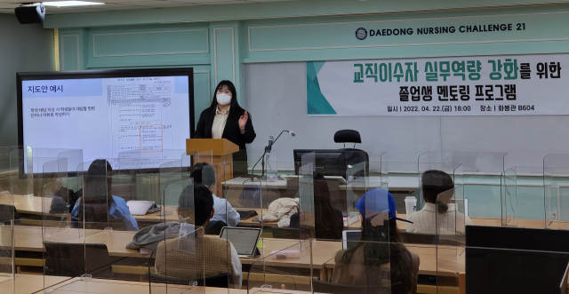 대동대학교(총장 배순철) 간호학부(학부장 남문희)에서는 지난달 22일(금), 25일(월), 간호학부 보건교사 이수자를 대상으로 '학교현장의 실무역량 강화를 위한 졸업생 멘토링 프로그램'을 진행하였다. 이번 프로그램은 현재 보건교사로 활동 중인 졸업생을 멘토로 선정하고 이들이 올해 교직을 이수한 재학생들에게 학교현장에서 교직과목관련 현장실습을 이수하기 위한 꿀 팁과 현장실습 시 재학생들이 가장 힘들게 생각하는 교육계획안을 작성하는 방법 등을 지도하게 하였다.
