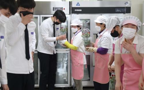 어버이날을 앞두고 4일 부산 용인고등학교에서 학생들이 급식실 종사자들에게 감사의 카네이션을 전달하고 있다. 용인고는 인성교육의 일환으로 매년 부모님과 학교 종사자들에게 감사의 마음을 전달하는 행사를 이어오고 있다. 이재찬 기자 chan@