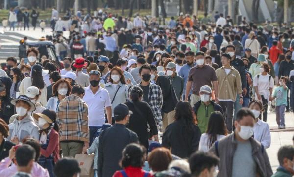 사회적 거리 두기 해제 이후 처음 맞이한 징검다리 연휴 마지막 날인 8일 오후 휴일을 즐기기 위해 나온 나들이객들이 해운대해수욕장 호안도로를 가득 메우고 있다. 김종진 기자 kjj1761@