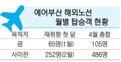 에어부산의 이 같은 움직임은 날갯짓을 하고 있는 괌, 사이판 노선의 영향이 크다. 김해공항에서 출발하는 괌 노선 월별 탑승객은 재취항 첫 달인 1월 65명에 불과했으나 4월에는 105명까지 늘었다. 2월 재개된 사이판 노선도 첫 달 탑승객 수가 252명이던 것이 지난달 486명까지 증가했다. 모두 주 2회 노선이 증편되면서 단기 여행상품이 출시된 덕분이다.
