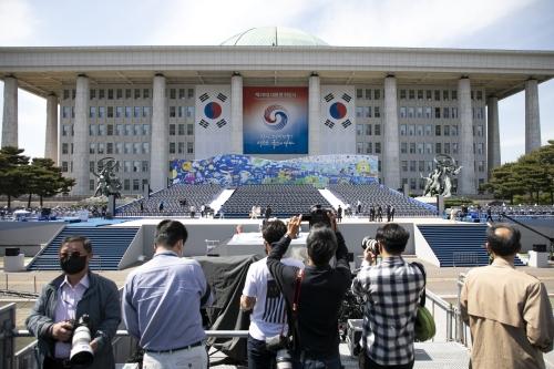 제20대 대통령 취임식을 하루 앞둔 9일 오후 국회 본관 앞에 마련된 취임식장에서 취재진이 현장을 확인하고 있다. 국회사진기자단윤석열 대통령 당선인이 10일 0시 대한민국 제20대 대통령으로 공식 임기를 시작했다. 이와 동시에 대통령 권력의 상징인 ‘청와대 시대’가 저물고, ‘용산 시대’가 열린다. 정치 입문 1년의 ‘0선 대통령’이 새로운 공간에서 열어갈 윤석열 정부 5년이 기대와 우려 속에 마침내 출발점에 선 것이다.