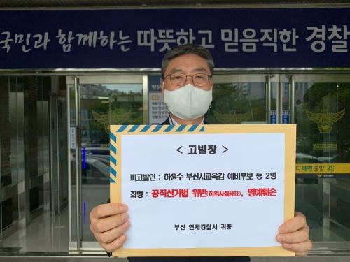 부산시교육감 선거 김석준 예비후보 측이 10일 하윤수 예비후보 등에 대한 고발장을 경찰에 제출했다(왼쪽 사진). 하 예비후보 측이 지난 2일 김 예비후보를 부산시선관위에 신고하고 있다. 각 예비후보 캠프 제공6·1 지방선거를 20여 일 앞두고 사상 첫 맞대결로 치러지는 부산교육감 선거가 캠프 간 신고와 고발이 잇따르는 등 혼탁·과열 양상으로 치닫고 있다. '보수 교육감'을 표방한 하윤수 예비후보 측의 이념 공세 등에 현 교육감인 김석준 예비후보 측이 정면 대응으로 맞서면서 선거일이 다가올수록 양 측의 공방전은 더욱 치열해질 것으로 보인다.