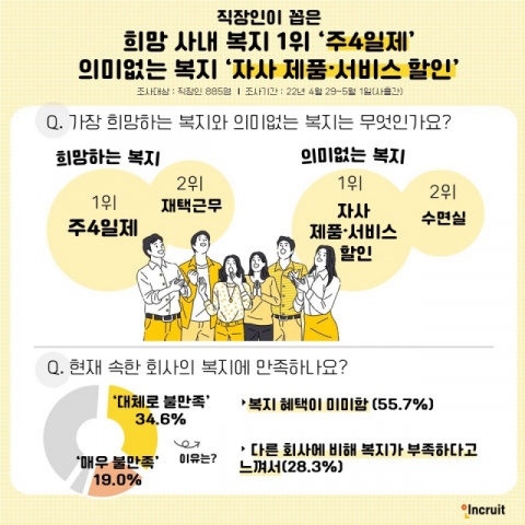취업포털 인크루트가 직장인 885명을 대상으로 설문조사한 결과, 도입 희망 사내 복지제도로 가장 많은 응답자(23.4%)가 '주4일제'를 선택했다고 밝혔다.