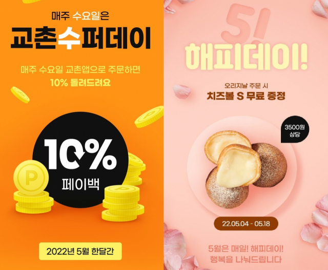 △교촌치킨이 가정의 달 5월을 맞아 교촌치킨 주문앱에서 다양한 이벤트를 마련하고 주문앱 고객들에게 풍성한 혜택을 제공한다. 5월 매주 수요일마다 교촌치킨 주문앱에서 오리지날치킨 5종 주문 고객을 대상으로, 총 주문 금액의 10%를 포인트로 적립해주는 '교촌 水퍼데이'를 진행한다. 적용 제품은 '교촌오리지날', '허니오리지날', '레드오리지날', '반반오리지날', '리얼후라이드' 5종이다. 적립된 포인트는 주문 익일 적립되며, 추후 주문 시 현금처럼 사용 가능하다. 또 18일까지 주문앱에서 오리지날치킨 5종(교촌오리지날, 허니오리지날, 레드오리지날, 반반오리지날, 리얼후라이드)을 주문 시, 교촌의 인기 사이드 메뉴인 치즈볼을 증정하는 이벤트도 함께 마련했다. '교촌 퐁듀 치즈볼'과 '교촌 고르곤 치즈볼' 중 선택 가능하며, 원하는 제품을 장바구니에 담은 후 결제 시 이벤트 쿠폰을 선택하면 된다. 단, 모바일상품권 사용 시에는 적용 불가하다.
