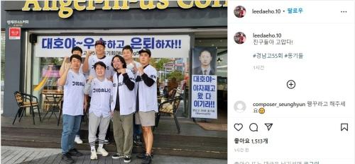 경남고 55회 졸업생 20여 명은 12일 부산 사직구장에 모였다. 이들은 올 시즌을 끝으로 은퇴하는 동기 친구 이대호를 축하하기 위해 함께했다. 이대호의 친구들은 사직구장 내 한 카페에서 롯데 선수들과 구단 임직원에게 100여 잔의 커피를 대접했다. 졸업생들은 카페 입구에 ‘대호야! 우승하고 은퇴하자!’라고 적힌 플래카드를 내걸기도 했다.