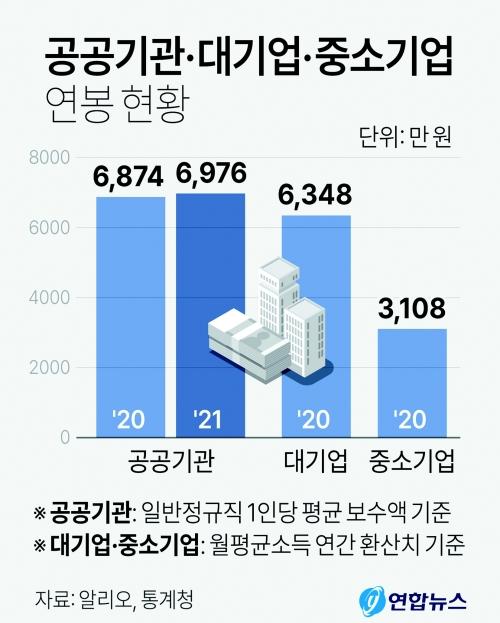 통계청의 ‘2020년 임금근로일자리’를 살펴보면 우리나라 대기업과 중소기업 근로자 평균 연봉은 각각 6348만 원과 3108만 원이다. 이를 감안하면 공공기관 연봉은 대기업보다 많고 중소기업의 2.2배 수준이었다.