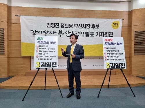김 후보는 연일 생활밀착형 공약들을 발표하며 대형 프로젝트 공약을 내세우는 양강 후보와 차별화한다. ‘같이 살자, 부산’을 슬로건으로 월 1만 원으로 무제한 대중교통 이용, 월 3만 원으로 병원비 해결, 부산거점대에 1000억 원 투자, 사회연대기금 1조 원 조성 등을 제시했다.