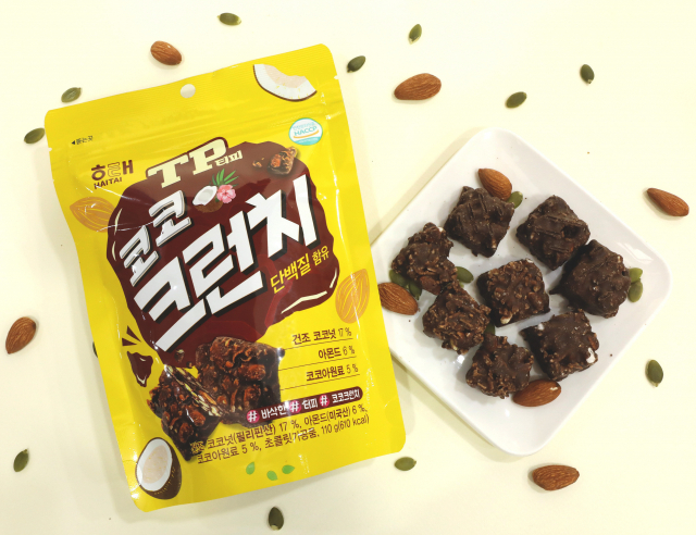 △해태제과는 원조 초코볼 티피의 바삭함을 그대로 담은 영양초코바 '티피 코코크런치'를 출시한다. 국내 초코바 중 유일하게 오븐에 구워 만든 것이 특징이다. 견과류를 당액에 뭉쳐 만드는 일반공정 대신 오븐에 굽는 방식을 적용했다. 덕분에 찐득함 없이 한층 더 가볍고 바삭하게 즐길 수 있다. 초코바의 핵심인 코코넛, 아몬드, 호박씩 같은 견과류를 듬뿍 담은 것도 장점이다. 기존 초코바 보다 2배 가량 많이 들어가 한입 가득 진한 고소함을 느낄 수 있다. 단백질도 초코바 중 가장 많은 달걀 2개 분량(11g)이라 영양초코바로 즐기기 손색없다.