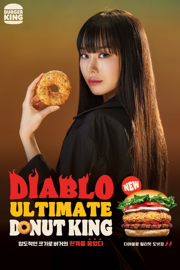 △프리미엄 버거 브랜드 버거킹이 압도적인 크기로 버거의 한계를 뚫은 '디아블로 얼티밋 도넛킹'을 출시한다. 기존 치킨 패티보다 중량은 40%, 높이는 60% 증가한 도넛 모양의 치킨 패티와 직화로 구운 100% 순 쇠고기 패티를 함께 즐기는 풍성한 맛과 압도적인 크기가 특징이다. 버거킹만의 특제 비법으로 만들어 대용량 출시 요청을 받은 인기 소스인 '디아블로 소스'와 프리미엄 흑맥주 브랜드의 묵직한 바디감을 더한 풍미 좋은 '기네스 BBQ' 소스가 감칠맛을 더한다. 출시를 기념해 버거킹은 오는 23일부터 고객이 직접 참여할 수 있는 다채로운 이벤트를 순차적으로 진행할 예정이다.