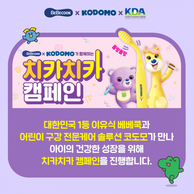 △라이온코리아의 어린이 구강 전문 브랜드 '코도모'가 영유아 식품 전문 기업 '베베쿡'과 함께 1년간 '치카치카 캠페인'을 벌인다. 이유식 시작 시기에 맞춰 본격적인 구강 건강 관리를 시작할 수 있도록 적합한 제품 및 올바른 칫솔질 방법 등을 알리며, 대중에게 브랜드의 기능성과 전문성을 명확히 인식시키려는 취지다. 16일 시작되는 치카치카 캠페인을 통해 향후 1년간 베베쿡에서 이유식을 첫 주문하는 고객에게 0~2세용 '코도모 안심 젤리 칫솔'과 라이온코리아 공식몰에서 사용할 수 있는 40% 할인 쿠폰을 함께 제공한다. 또 베베쿡, 대한치과의사협회와 함께 카드뉴스와 영상 형태의 교육성 콘텐츠도 제작한다. △유치와 영구치의 차이점 △유아 충치 예방 방법 △연령별 칫솔 고르는 방법 △칫솔 교체 시기 등 영유아 구강 건강 관리에 대한 올바른 정보를 전달한다는 계획이다.
