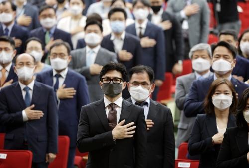 윤석열 정부의 초대 법무부 장관으로 임명된 한동훈 장관이 17일 정부과천청사에서 열린 취임식에서 국기에 경례하고 있다. 연합뉴스