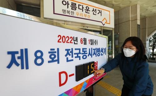 6·1 지방선거가 보름 앞으로 다가온 17일 부산시선거관리위원회 직원이 선관위 입구에 설치된 선거일 안내판의 날짜를 수정하고 있다.