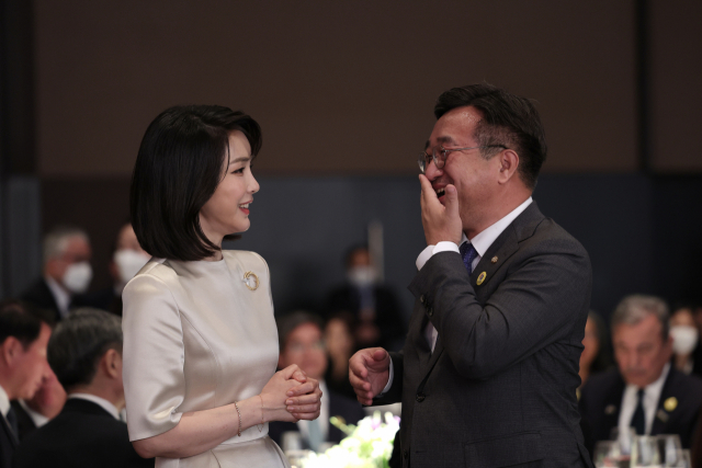 더불어민주당 윤호중 비상대책위원장이 지난 10일 서울 신라호텔에서 열린 대통령 취임 외빈 초청만찬에서 윤석열 대통령 부인 김건희 여사와 한담하면서 함박웃음을 짓고 있다. 연합뉴스