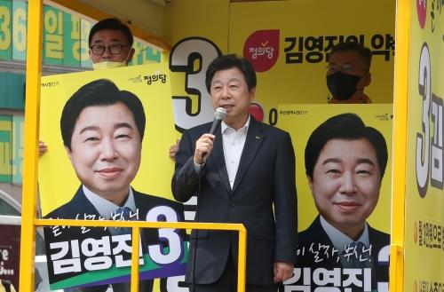 김 후보는 이날 유세 무대에서 “부산 시민은 24년간 국민의힘이 독점해 온 부산 정치를 바꾸고자 4년 전 더불어민주당을 선택했지만, 결국 기대와 바람은 물거품이 됐다”면서 “기득권 보수 양당에 부산의 미래를 맡겨서는 안전한 일상과 건강을 지켜낼 수 없음을 우리는 확인했다”고 말했다. 또 “코로나19로 더 불안해진 우리의 일상과 불평등을 온전히 해결할 수 있는 시장 후보는 저 김영진”이라고 강조했다.