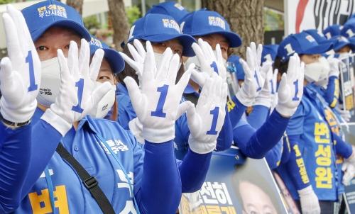 제8회 전국동시지방선거 공식선거운동이 19일 시작됐다. 이날 부산시장 선거에 나선 더불어민주당 변성완, 국민의힘 박형준 후보의 선거운동원들이 당을 상징하는 파란색, 빨간색 옷을 맞춰 입고 지지를 호소하고 있다. 김종진 기자 kjj1761@