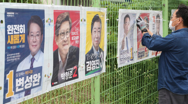 제8회 전국동시지방선거 공식 선거운동 첫날인 19일 오전 부산 수영구 망미1동 행정복지센터 앞에서 구청 관계자들이 선거벽보를 설치하고 있다. 강선배 기자 ksun@