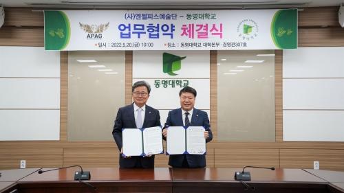동명대학교(총장 전호환·왼쪽)는 지난 20일 대학본부경영관 307호에서 (사)엔젤피스예술단(이사장 김충석·오른쪽)과 첨단기술-문화예술 융복합 콘텐츠 공동 개발과 상용화, 실습·전문인력 양성, 전용 공연장 교내 설립, 2030부산세계박람회 유치 등을 위한 협력 협약을 체결했다.