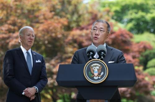 정 회장은 바이든 대통령을 향해 “방한 기간 시간을 내줘서 매우 감사하다. 진심으로 영광”이라면서 “바이든 행정부가 우리 미국 사업에 지속적인 지지를 해 주기를 정중히 요청한다”고 전했다.