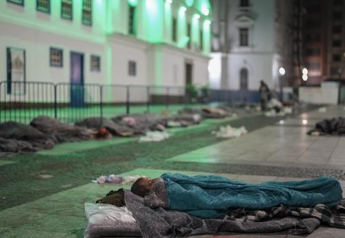 브라질 상파울루 파치우 두 콜레지우 광장에서 20일(현지시간) 노숙인들이 잠을 청하고 있다. 최근 조사에 따르면 브라질에서는 코로나19 팬데믹 이후 노숙 인구가 종전 대비 30% 증가했다. 브라질은 전날 올해 성장률 전망치를 기존 2.1%에서 1.5%로 하향 조정하고 물가 상승률 전망치를 6.55%에서 7.9%로 상향했다. AP연합뉴스