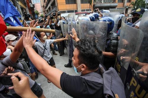 필리핀 경찰이 21일(현지시간) 마닐라의 미국 대사관 주변에서 조 바이든 대통령의 한국, 일본 방문에 항의하는 시위대를 해산시키고 있다. AFP연합뉴스지난 주말 한국에서 열린 한·미정상회담에 대해 중국 등 주변국이 촉각을 곤두세우며 민감하게 반응하고 있다. 중국 매체와 오피니언 리더들은 “한국이 미국의 편에 서서 중국을 억제하는 길에 들어섰다”며 불편한 심기를 감추지 않았다. “한국의 이익이 손해를 입을 것” “대가를 치르게 될 것”이라는 식의 격앙된 반응도 나왔다.