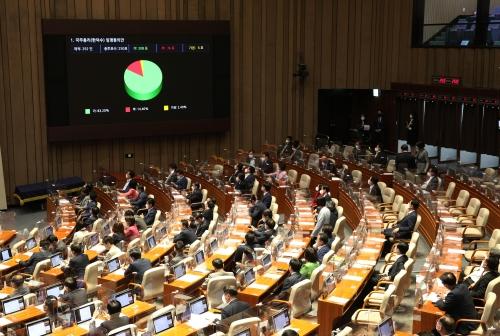 지난 20일 오후 국회 본회의에서 한덕수 국무총리 후보자의 임명동의안이 통과되고 있다. 연합뉴스한덕수 국무총리 인준안이 우여곡절 끝에 통과되고, 메가톤급 외교 이벤트인 한·미정상회담이 마무리됨에 따라 윤석열 대통령이 이제 정호영 보건복지부 장관 후보자의 거취에 대한 결정을 내려야 할 시간을 맞았다.