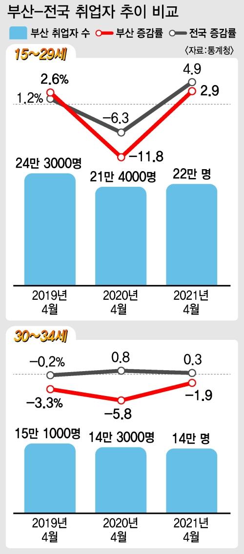 보고서에 따르면, 코로나19 발생 직후인 2020년 상반기에 부산 청년 취업자가 크게 감소하면서 고용률도 하락한 것으로 나타났다. 취업자의 경우 15~29세가 전년 동기 대비 약 2만 9000명(-11.8%), 30~34세가 약 8000명(-5.8%) 감소했다. 같은 기간 전국(각각 6.3%, 0.8%)에 비해 감소세가 매우 컸다. 고용률도 15~29세가 2020년 상반기에 3.8%포인트(P) 하락한 38.3%, 30~34세가 3.4%P 하락한 75.1%를 기록해, 전국의 2.0%와 0.5%보다 하락 폭이 크게 나타났다. 특히 30~34세 경우는 코로나19 발생 이전에 고용률이 78.5%로 전국(75.5%)보다 높았지만, 2021년 상반기에는 73.2%로 전국(75.8%)에 비해 더 낮아졌다.