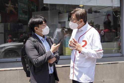 국민의힘 박형준 부산시장 후보가 23일 낮 12시 40분께 부산 사하구 괴정골목시장 앞에서 짬을 내 <부산일보> 이승훈 기자와 인터뷰를 하고 있다. 박 후보는 시민들의 셀카 촬영 요청에 일일이 응했다. 김종진 기자“후보님! 후보님! 그리로 가시면 안 됩니다. 이동하셔야 돼요.”