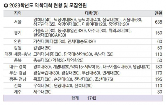 2023학년도 약대 모집인원은 ‘정원 내’ 기준으로 1743명이다. 이화여대는 약학과(90명) 외에도 미래산업약학과(30명)를 나눠 모집하는데, 약학전공은 자연계열로 분류돼 미적분/기하와 과학탐구 2과목을 응시해야 하지만 인문계열인 미래산업약학전공은 확률과통계와 사회탐구 2과목을 응시해도 지원할 수 있다. 2022학년도에 신설된 미래산업약학전공은 기존 약학전공 토대 위에 글로벌 융복합 교육을 추구하며, 미래 글로벌 바이오헬스 산업 관련 인재양성을 목표로 약학전공 교과목 외 전공 선택과목으로 경영학·심리학·마케팅 관련 과목도 수강하는 차이점이 있다.