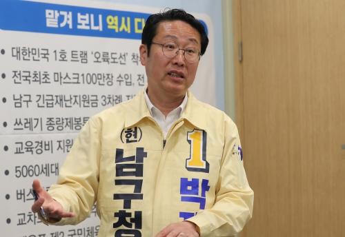 박 후보는 지난 4년간 초선 구청장으로 일하며 코로나19 방역 대응과 지역 경제 활성화 정책을 성과로 평가했다. 그는 “마스크 대란 때 마스크 100만 장을 수입해 남구 전 주민에게 무료로 배부했고, 재난지원금을 3차례나 지급했다”며 “지역 경제를 살리기 위해 추진한 지역화폐 ‘오륙도페이’와 공공배달앱 ‘어디go’는 연착륙 단계”라고 설명했다.