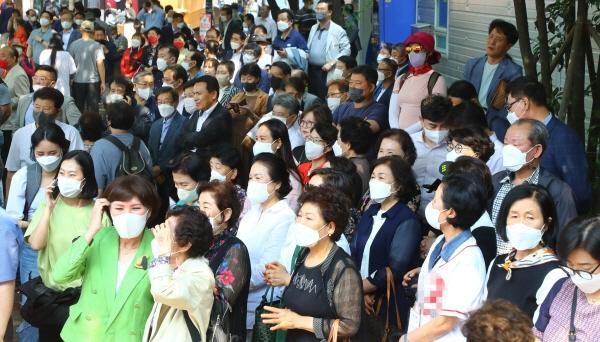 6·1 전국동시지방선거가 일주일 여 앞으로 다가온 24일 부산 동래구에서 열린 한 후보의 유세에서 시민들이 후보의 연설을 관심있게 지켜보고 있다. 정종회 기자 jjh@메가시티(변성완), 15분 도시(박형준), 무제한 대중교통 이용(김영진).