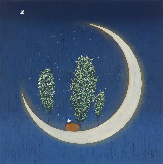 커다란 초승달 안, 나무가 자라고 작은 집 위에서 새가 하늘을 본다. ‘그림 속에 봄날을 만들어 줄게’라고 그림이 말을 거는 듯하다. 이영지 개인전 ‘속닥속닥’은 6월 4일까지 부산 해운대구 우동 아트소향에서 열린다.