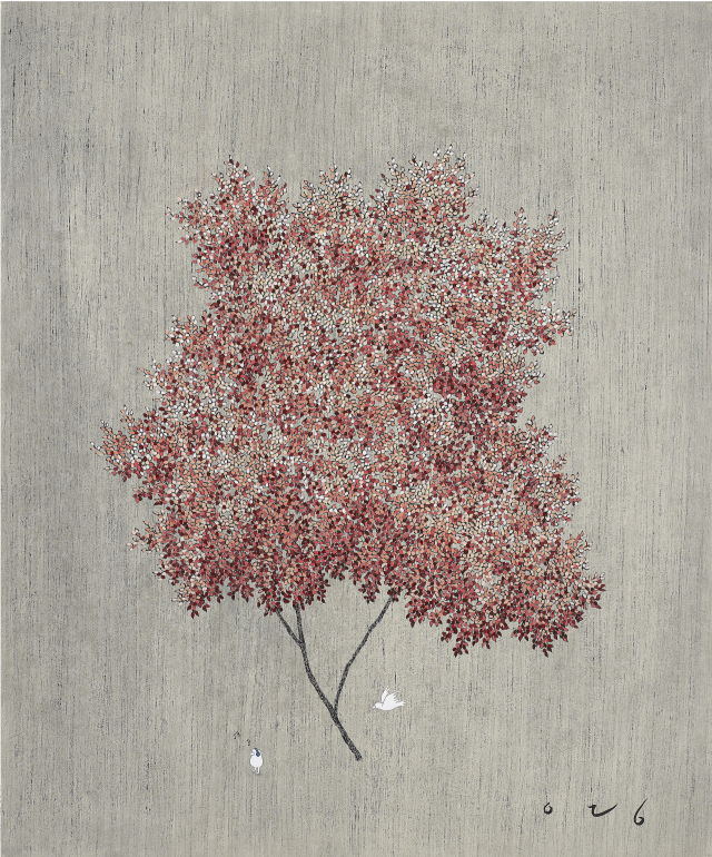 전시장 중앙에 걸린 다섯 개의 나무 연작은 나무만으로 표현하던 초기 작업 시기를 떠올린 작품이다. “뭔가 그려 넣고 싶은 마음을 꾹 참았어요. 먹선으로 분위기만 살리고 일부러 새도 작게 그렸어요.”