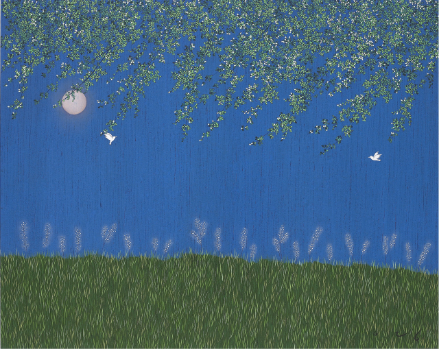 이 작가는 장지에 아교포수를 하고 먹 작업을 한다. 그는 회벽 느낌을 내고 싶어 붓을 만들어서 사용한다고 했다. 분채 채색 아래로 바탕의 질감이 살아나는 이유다. 짙은 푸른색에 반짝이는 윤슬을 표현한 그림과 초록 풀밭의 풍경도 매력적이다. 올해 처음 시도했다는 배경의 그라데이션 작업도 눈길을 끈다.