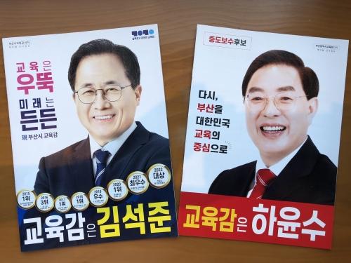 부산시교육감 선거 김석준 후보와 하윤수 후보의 선거공보(왼쪽). 양 후보가 각각 내건 선거 현수막 모습.6월 1일 부산시교육감 선거에서 치열한 승부가 예상되는 김석준 후보와 하윤수 후보가 표심을 잡기 위해 상반된 ‘색깔 전략’을 펼쳐 눈길을 끈다. 정당 공천이 없는 교육감 선거에서 김 후보는 진보 성향의 더불어민주당과 거리를 두는 반면 하 후보는 보수 성향 국민의힘과의 연관성을 강조한다.