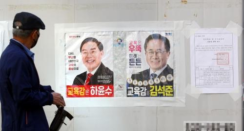 부산 동구 수정동 거리에 부착된 선거벽보 옆에 하윤수 교육감 후보의 ‘학력 기재’ 내용을 바로잡는 공고문이 붙어 있다. 정종회 기자민선 첫 맞대결로 박빙이 예상되는 부산시교육감 선거에서 하윤수 후보가 ‘학력 기재’와 관련해 선거법 위반 판정을 받아 막판 변수가 될 것으로 보인다. 하 후보는 단순 착오로 인한 실수일 뿐 ‘허위 학력’은 아니라는 입장이다.