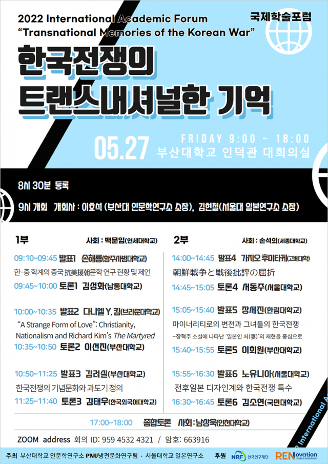 부산대학교(총장 차정인) 인문학연구소 PNU냉전문화연구팀(연구책임자 김려실 교수)이 오는 27일 서울대학교 일본연구소와 공동주최로 '한국전쟁의 트랜스내셔널한(초국적) 기억'이란 주제로 '제4회 한국전쟁과 메타기억 포럼'을 개최한다.