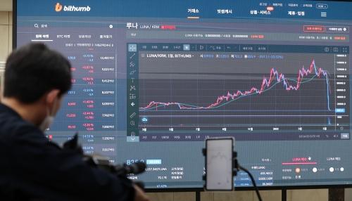 한국산 가상자산인 루나 사태의 여진이 지속되고 있다. 폭락한 루나 코인의 시세가 표시된 서울 서초구 빗썸 고객센터 전광판. 연합뉴스이달 들어 99.9% 이상 폭락해 국내 가상자산 시장에 큰 충격을 준 한국산 가상화폐 루나(LUNA) 사태의 여진이 지속되고 있다.