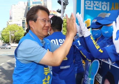 6·1 지방선거를 앞둔 마지막 주말 부산시장 후보들이 부산 곳곳에서 막바지 유세전을 벌였다. 29일 연제구 연산교차로에서 선거운동원들과 인사를 나누는 더불어민주당 변성완(왼쪽) 후보, 북구 구포시장에서 집중 유세를 벌이는 국민의힘 박형준(가운데) 후보, 부산진구 어린이대공원에서 시민과 인사하는 정의당 김영진 후보. 이재찬·정종회 기자 chan@부산시장 후보들이 6·1지방선거를 앞둔 마지막 주말 각기 다른 막판 전략을 구사하며 세 결집에 나섰다. 비교적 낮은 사전투표율을 극복하기 위해 남은 기간 어떤 전략을 펼지도 주요 볼거리다.