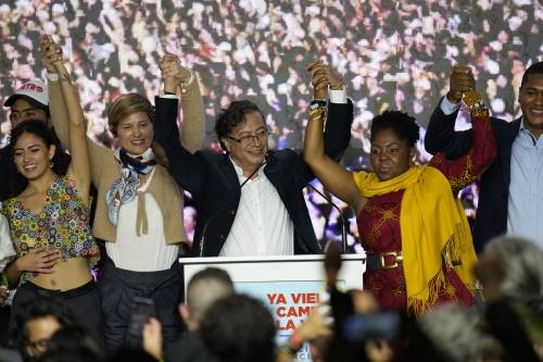 콜롬비아 좌파 연합 ‘역사적 조약’의 구스타보 페트로 대통령 후보와 러닝메이트 프란시아 마르케스가 29일(현지시간) 보고타에서 열린 ‘선거의 밤’에서 지지자들 환호에 답하고 있다. AP연합뉴스콜롬비아 대통령 선거가 게릴라 출신 좌파 후보와 기업인 출신 ‘포퓰리스트’ 후보의 맞대결로 압축됐다. 콜롬비아 대선 1차 투표에서 좌파 후보가 선두를 차지했지만 과반 득표를 하지 못해 다음달 19일 결선에서 2위 무소속 후보와 맞붙게 됐다. 콜롬비아까지 좌파 정권이 들어서면 중남미 핑크 타이드(좌파 집권 확산)가 더욱 거세지게 된다.