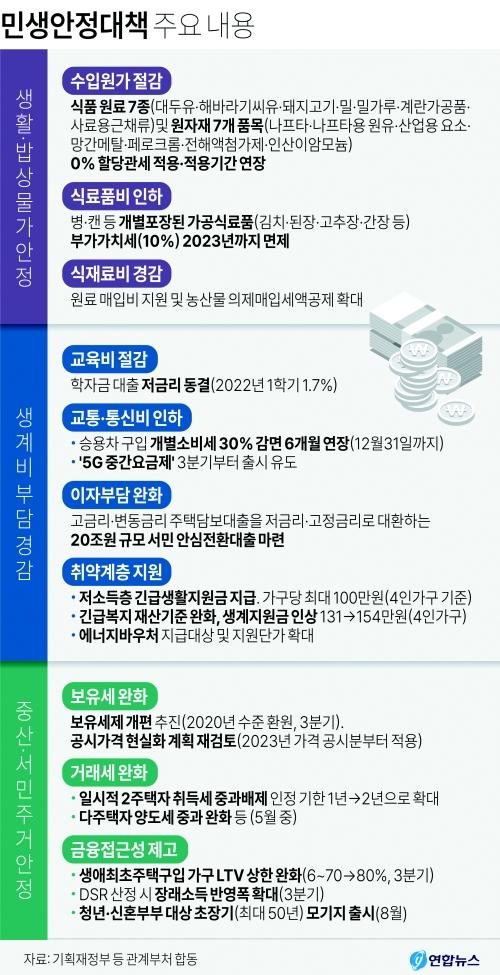 정부가 30일 발표한 ‘민생안정 10대 프로젝트’는 수입 식재료 가격을 내리고 생활물가 부담을 덜며 부동산 세금도 덜 낼 수 있도록 하는 등 먹거리·생계비·주거 등 3대 분야를 중심으로 구성됐다. 인플레이션이 심각한 상황에서 윤석열 정부 출범에 맞춰 민생 달래기에 나선 모양새다.