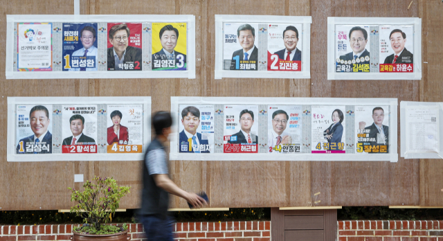 제8회 전국동시지방선거 투표일을 하루 앞둔 31일 오후 한 시민이 부산 동구 범일동 거리에 붙은 선거 벽보를 살펴보고 있다. 김종진 기자 kjj1761@