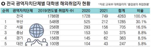 전국 대학 졸업생 중 해외취업자를 가장 많이 배출한 도시는 부산으로 나타났다. 부산 지역 취업난에 더 나은 일자리를 찾아 해외로 눈을 돌리는 부산 청년이 많고, 그에 따른 부산시와 지역 대학의 해외 취업 지원도 많기 때문으로 분석된다.