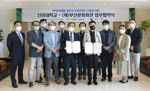 신라대학교(총장 김충석·앞줄 왼쪽 네 번째)는 지난달 25일 지역 문화예술 발전과 문화콘텐츠 분야 전문 인재 양성을 위해 (재)부산문화회관(대표이사 이정필·앞줄 왼쪽 다섯 번째)과 업무협약을 체결했다.