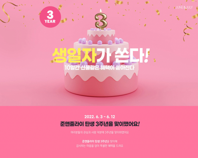 △그리티가 바디&홈웨어 플랫폼 준앤줄라이의 론칭 3주년을 기념해 3일부터 오는 12일까지 약 2주간 다양한 축하 이벤트를 진행한다. '100원', '9900원' 등 놓칠 수 없는 다양한 특가 이벤트를 만날 수 있다. 먼저, '100원에 신상을 잡아라' 이벤트로 준앤줄라이가 마련한 '100원' 특가 딜 상품을 구매한 고객들을 대상으로 자동 추첨을 통해 인기 브랜드 '언더웨어 세트'(5명) 등 깜짝 경품을 증정한다. 또 '9,900원에 최신상도 잡자!' 역시 해당 딜 상품 구매 고객 대상 추첨을 통해 '언더웨어 풀 세트'(3명), '준앤줄라이 30% 할인 쿠폰 2매(5명·5만 원 이상 구매 시 사용 가능)' 등의 경품을 증정하며, 미 당첨 고객에게는 9900 포인트를 자동 지급한다. 두 이벤트 모두 준앤줄라이 온라인몰 회원가입 후 참여 가능하다. 행사 기간 동안 1만 원 이상 품목에 대해 10% 할인·무료 배송 혜택을 제공하며, 그리티 인기 언더웨어 브라 4종 세트 구매 시 팬티를 선물로 함께 증정한다.