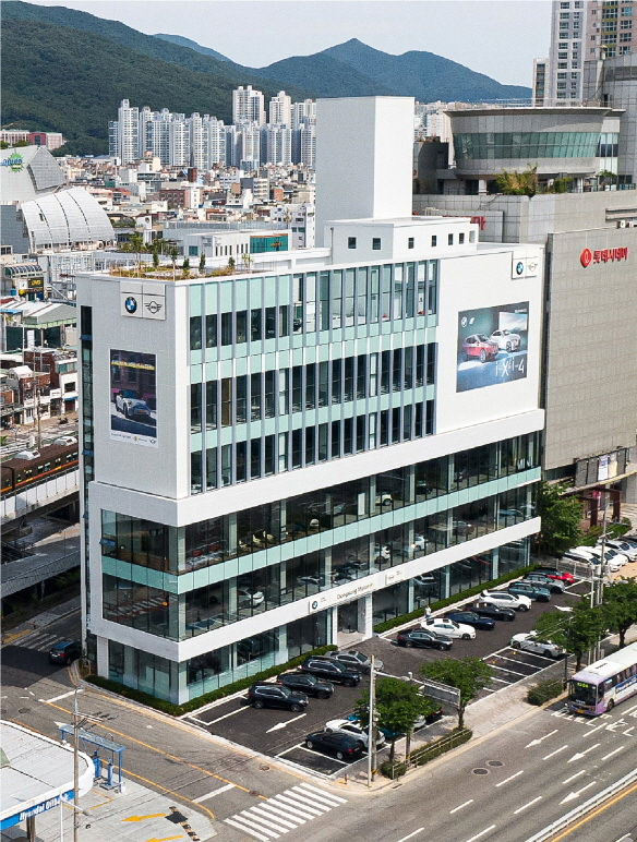 부산 금정구 중앙대로에 위치한 금정 통합센터는 연면적 약 1500평 규모의 지상 6층 건물에 BMW·미니 신차 전시장과 서비스센터가 함께 자리잡고 있다.