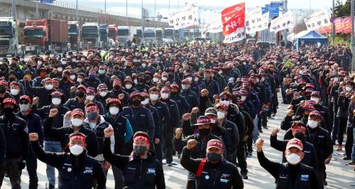 지난해 11월 부산 강서구 부산신항 삼거리에서 민주노총 공공운수노조 화물연대본부 부산지부 조합원들이 총파업 출정식을 열고 있다. 부산일보DB화물연대가 올해 말 일몰이 되는 안전운임제를 계속 유지할 것을 촉구하며 7일 전국적으로 총파업을 예고하고 나섰다. 부산의 경우 7일 0시부터 강서구 부산신항과 남구 신선대부두, 감만부두 등 주요 항만 일대에서 파업이 진행될 전망이다.